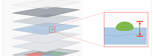 투명 층 내부 이물이 여러 층에 겹쳐 보이거나 흐릿하게 나타나 정확한 위치와 높이 측정이 어려운 경우의 이물 높이 측정